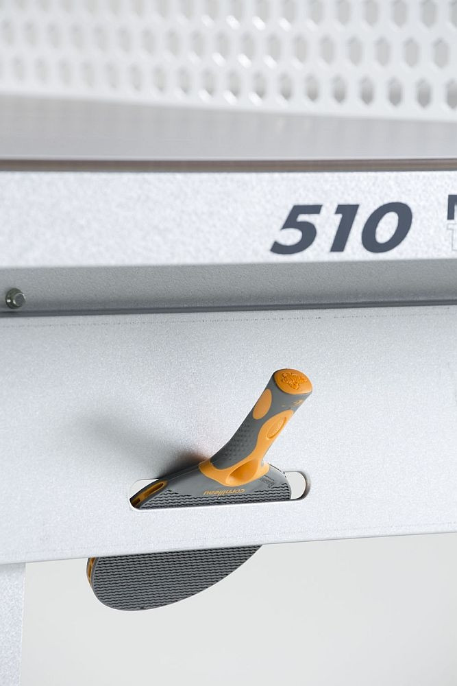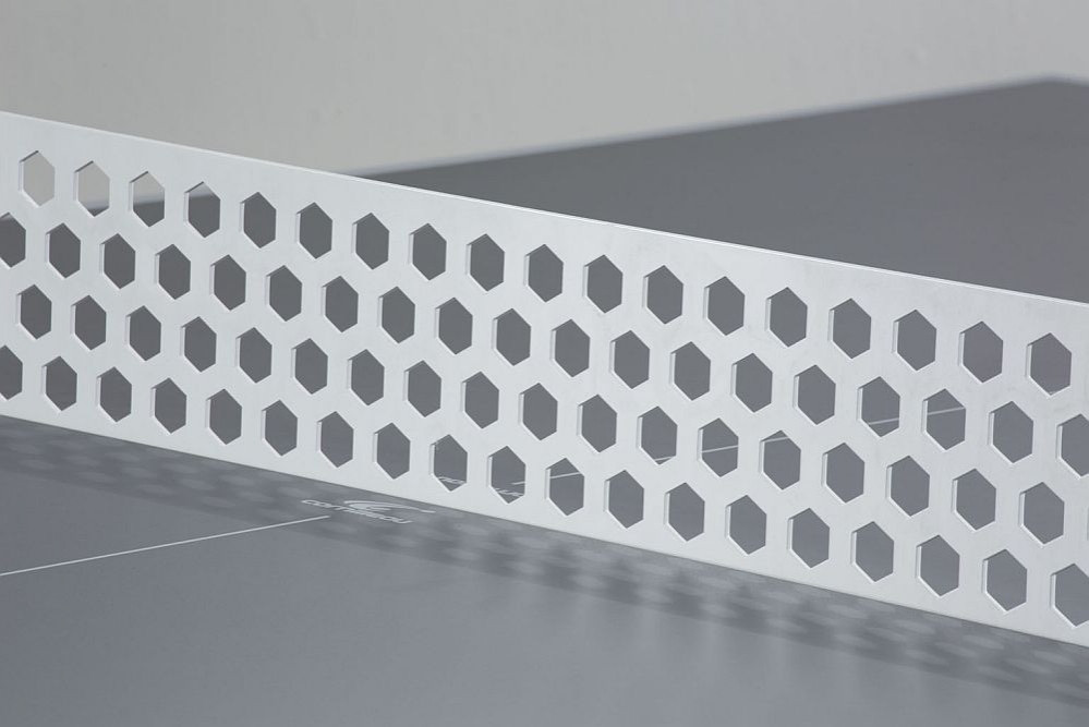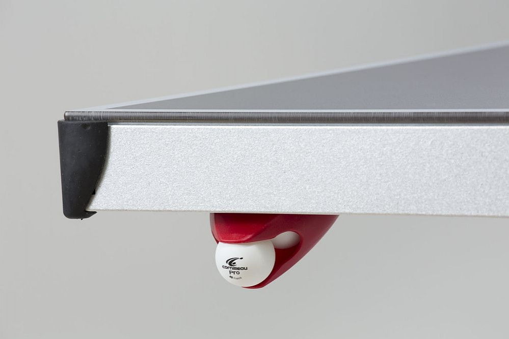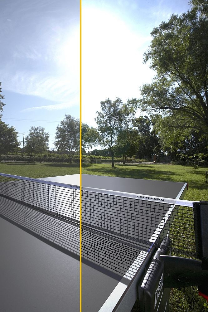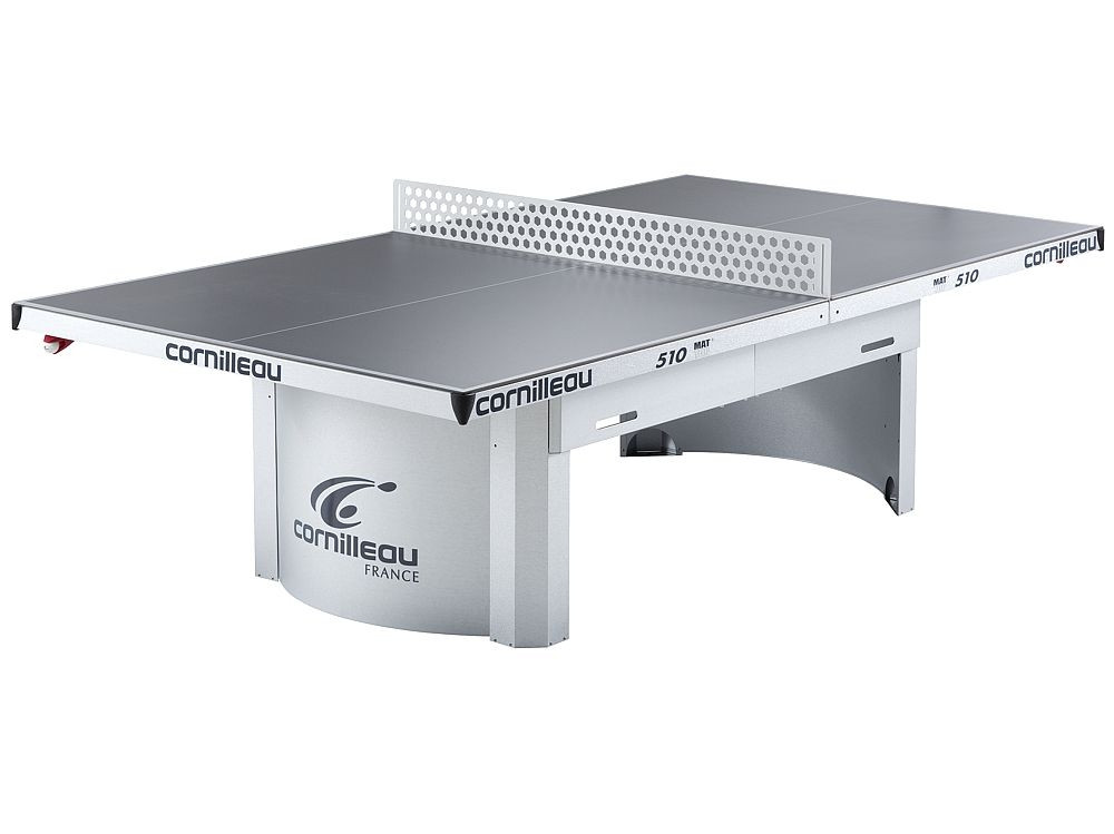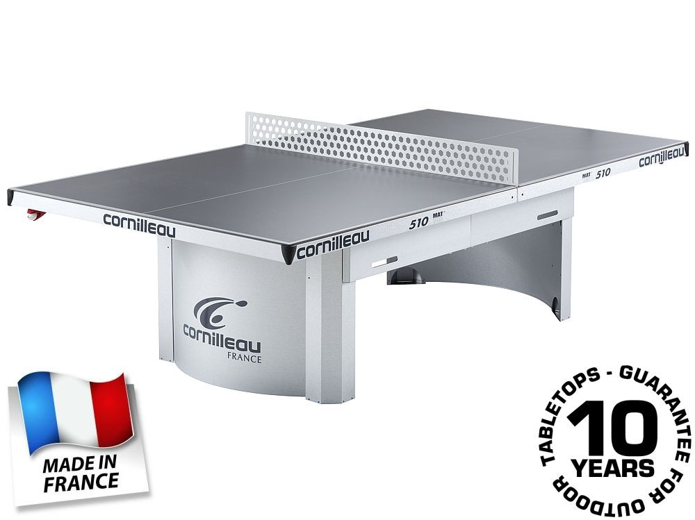 Cornilleau 510 Mat Top stol za stolni tenis u vansjkom prostoru, otporan na vremenske uvjete, za javne površine i zajedničko korištenje (SIVE BOJE) : Stol 510 je visokootporan i vrlo robusne izvedbe. Važno je znati da stol nije osiguran od vandalizma, ali je odličan izbor za hotele, javne trgove, površine. Zbog masivnosti, pričvršćivanja nosača na tlo i modernog dizajna, brojni camping i wellness hoteli biraju taj model . Od 2013 godine mrežu je tekstilna i podesiva, koju isporučujemo sa stolom. Značajke: težina: 77/97kg neto / Boja površine :siva Materijal ploče: ploča na bazi smole 7mm Okvir: metalni okvir 60mm debljineNosači stola: metalni Kotači: ne Mreža : metal, fiksna. Mreža podesiva u visini: Ne Mreža podesiva u napetosti: NeDSI: Ne Kompaktna tehnologija: Ne Jamstvo na ploču stola:10 godina Jamstvo na okvir: 3 godineIzvedba udovoljava standarde EN-14468-1.Ploča stola otporna na udarac reketa Jamstvo: Stolovi za vanjsku upotrebu su izvanredno kvalitetne, mogu se skladištiti u slobodnom prostoru tokom cijele godine, odgovornost proizvođača ne obuhvaća štete nastale od nevremena. Jamstvo na okvirnu konstrukciju 3 godine, na ploču 10 godina. za stolove u unutarnjem prostoru jednako 3 godine. MAT TOP: površina stola je specijalno bez sjaja, nereflektirajuća, usporedivši s drugim stolovima 10% imaju manji odsjaj. Cornilleau ekstra: 60 godina profesionalnog iskustva, vodeći proizvođač inovativna marka na tržištu .Svi dijelovi proizvedeni su u Francuskoj. Minimalno 10 godina snabdevanja rezervnim dijelovima i nakon prekida. 25 godina natjecajnog iskustva Know-How zaštićen: MAT TOP.