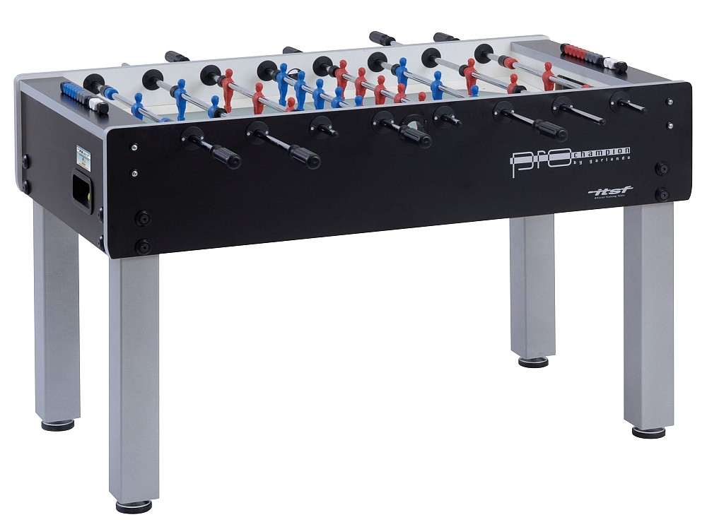 GarlandoPro Champion Stol za igranje stolnog nogometa: Ovaj stol za stolni nogomet je službena marka marke s ITSF logotipom. Svaki stol je jedinstveno numeriran s potpisanom izjavom proizvođača. Službeni međunarodne natjecateljski stol kategorije Pro Tour. Stol je izrađen od MDF-a debljine 25mm, s kombinacijom crno-sivog laka. Igralište ima službenu izjavu trening stol. Metalno postolje od 9x9cm obojeno sa srebrnim prahom. Boja je posebna, otporna na prskanje. Na nogama postoji natjecateljsko podešavanje visine stola, kako bi se stvorilo savršeno horizontalno igralište. Stol je opremljen šipkom od nehrđajućeg čelika promjera 16 mm s pokrovom od kroma.Odbijači su izrađeni od gume umjesto konvencionalnih opruga, a distancijska je veza postavljena na dvije strane vratara. Ručke su ergonomski oblikovane i izrađene od plastike (nisu identične oznakama serije G)Šipke stola kotrljaju se u kutiji s kugličnim ležajem, čija prisutnost ubrzava igru bez opterećenja na zapešće igrača. Oprema za stolni nogomet isporučuje se s 3 natjecateljske lopte Speed Ball. GarlandoPro Champion stolni nogomet s 360 stupnjeva okreta-po-skretanju vratara primjenjuje 3-godišnje jamstvo. Lutke su dostupne u kombinaciji plavo-crvene boje. Igralište je pokriveno pjeskarenom staklenom pločom protiv odsjaja, gdje se kugla kreće s boljim svojstvima od laminatnog poda.Brojač utakmica odgovara za standarde utrke. Ovaj stolni nogomet je službeno mjerilo marke s logom ITSF-a, svaki stol je jedinstveno numeriran s potpisom proizvođača. Služben stol za natjecanja kategorije Pro Tour. Dostupno s rotirajućim vratarima od 360 stupnjeva Igralište je prekriveno kaljenim nereflektirajućim pjeskarenim staklom. Čelične noge debljine 9x9cm, (srebro) Stolna strana je crna lakirana Noge podesive po visini Čelik od nehrđajućeg čelika 16mm, debljine materijala 2,2 mm. 21 mm široki gumeni odbojnici.Stol se isporučuje s 3D brzom igrom. Proizvod je pokriven jamstvom od 3 godine. Konstrukcija stola je izrađena od iverice debljine 30mm, površina je prekrivena crnim laminiranim materijalom, a rubovi su prekriveni aluminijskim ukrasima. Boja stola je crna, s logom ITSF-a, Stol je službeni stol za trening, svaka stavka ima jedinstveni serijski broj registriran u ITSF-u. Metalne noge debljine 9 x 9 cm pružaju vrlo visoku stabilnost. Sjaj je sa praškastim bojenjem srebra, boja je srebrna. Novi regulatori visine stola s gumom za savršeno horizontalno postavljanje igrališta. Šipka je valjani čelik s visokom otpornošću na savijanje i promjerom od 16 mm. Spojevi su obrađeni površinom kroma otpornom na koroziju. Na kvalitetu upotrijebljenih materijala ukazuje i debljina materijala štapa, koja je 2,2 mm, što jamči dugotrajnu stabilnost oblika. Može se koristiti dugo vremena bez savijanja. Štap je također dostupan u teleskopskoj verziji za korisnike koji se brinu za sigurnost. Opremljen novim 21mm gumenim odbojnicima, održava optimalnu udaljenost između zida i igrača. Vratarska veza je razmaknica koja drži golmana u skladu s vratima. Korištenje kugličnih ležajeva uvelike ubrzava brzinu igre, dok u isto vrijeme ručni zglob igrača nije izložen povećanom naprezanju. Jednobojne lutke: plastični igrači (mopleni) koji su stilizirani tako da oblikuju oblik izravno na štapu, ne mogu se skliznuti, ne mogu se montirati, drže se u savršenom položaju. Boje timova su crveno-plave kombinacije.Stol za stolni nogomet može se naručiti samo sa okretnim vratarem u 360 ° po natjecateljskom standardu.Rukohvati su izrađeni od ergonomski oblikovane plastike, a nisu identični s držačima G-serija. Igralište je izrađeno od pjeskarenog stakla čija površina nije prozirna, nije sjajna. Staklo je debljine 5 mm, očvršćeno u svim slučajevima. Bijelo obojene oznake potpuno vraćaju raspoloženje nogometnog igrališta. Nove slijepe plastike u kutovima stola ne oblikuju stepenice ni u kojoj mjeri, kugla se može vratiti na ravnu površinu bez mijenjanja smjera. Kugle se mogu postaviti na teren kroz rupu. Takav je otvor smješten s obje strane igrališta. Loptice su jednostavne za rukovanje, a ispod vratara su pohranjene kugle s obje strane.Brojač natjecateljske izvedbe, za brojanje utakmice, rezultata.Stol se isporučuje s 3D Speed Ball.